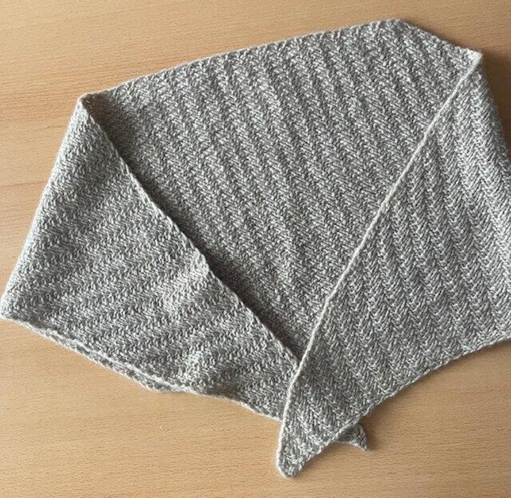 Der Schal wird in einem Stück gestrickt: Zunächst entsteht durch Zunahmen eine leichte Schräge an einem Ende, bei der Hälfte des Garns wechselt die Richtung, und der Schal läuft mit Abnahmen auf der gegenüberliegenden Seite mit einer asymmetrischen Schräge aus.